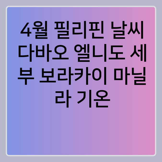 4월, 햇살 가득한 필리핀으로 떠날 계획이신가요? 에메랄드빛 바다와 아름다운 해변, 그리고 매혹적인 문화가 기다리는 필리핀은 4월 여행의 최고의 선택지 중 하나입니다. 하지만 여행 전 필리핀 각 지역의 날씨와 기온을 미리 확인하는 것은 성공적인 여행을 위한 필수 요소입니다. 이 가이드에서는 다바오, 엘니도, 세부, 보라카이, 마닐라 등 인기 여행지의 4월 날씨 정보를 자세히 알려드리겠습니다.